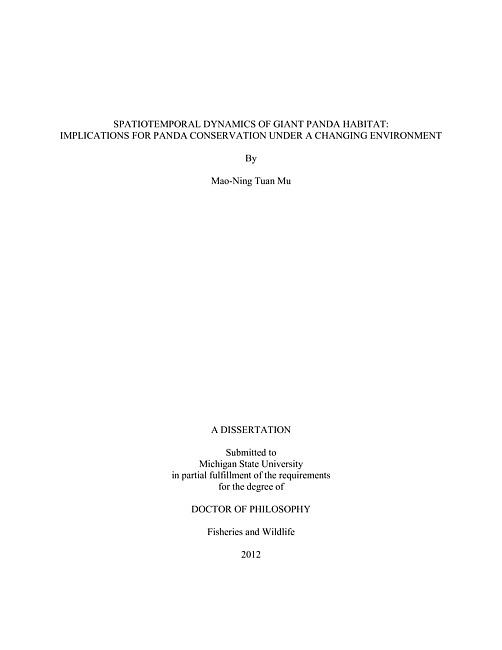 Under the current rapidly changing environment, effective and efficient actions for biodiversity conservation rely on detailed knowledge on the spatiotemporal dynamics of species distribution and habitat. However, inadequate spatiotemporal information on species habitat has compromised conservation effectiveness, even for one of the most endangered species on Earth, the giant panda (Ailuropoda melanoleuca). To address this information gap, the objectives of this dissertation were to: (1) develop an approach for remotely detecting the distribution of understory bamboo, the panda's staple food, across large geographic regions; (2) develop a modeling approach for monitoring panda habitat changes across space and time; (3) evaluate the effects of current conservation efforts on short-term panda habitat changes; and (4) assess the potential impacts of climate change on long-term panda habitat dynamics.--From abstract.