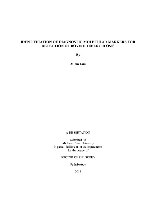 Identification of Diagnostic Molecular Markers for Detection of Bovine TuberculosisByAilam LimBovine tuberculosis (bTB) is distributed worldwide, creating a public health risk and causing substantial economic loss to cattle producers. Hence, control of bTB is important for both animal and human health. The tuberculin skin tests (TST) and whole blood interferon gamma ELISA (IFN-g assay) are the principal antemortem diagnostic assays used worldwide for bTB surveillance and in the "test and slaughter" based bTB control and eradication programs. The currently used TST and IFN-g; assays are less than perfect in test sensitivity and specificity, consequently false negative and false positive test results are common. Presently, in the state of Michigan, only 1-2% of the antemortem test-positive cattle culled for postmortem examination have bTB. To reduce the number of healthy cattle slaughtered for confirmation of bTB, diagnostic procedures capable of differentiating test-false positive cattle from true bTB infected cattle are needed. The objectives for the studies presented in this dissertation were: 1) identify differences in gene expression profiles between cattle that have bTB and those that are antemortem test-false positive, 2) analyze the differences in gene expression profiles to select potential molecular markers capable of differentiating bTB infected cattle from antemortem test-false positive cattle, 3) begin a validation process to confirm that the selected molecular markers are able to differentiate bTB infected cattle from antemortem test-false positive cattle.To accomplish those objectives, microarray hybridization experiments were used to examine gene expression profiles from small groups of bTB infected and antemortem test-false positive cattle. Quantitative real-time PCR (qPCR) assays were used to validate data derived from the microarray hybridizations and to test selected molecular markers for disease on larger groups of bTB infected and antemortem test-false positive cattle.In the initial study, cattle were grouped as single antemortem test-false positive (SFP), double antemortem test-false positive (DFP), and postmortem confirmed bTB infected (bTB). Whole blood from the cattle was stimulated for 4 hours with purified protein derivative made from cultures of Mycobacterium bovis (bPPD). Unique gene expression profiles were identified from the microarray hybridizations and qPCR assays confirmed that the gene expression profiles differentiated cattle in the bTB group from cattle in the DFP group, but not the SFP group.In subsequent studies, the period of antigen stimulation of whole blood was extended to overnight; the microarray hybridization library was changed to provide thousands of additional genes for testing. Also, a new group of cattle was created that consisted of animals that were from bTB free herds and were single antemortem test-false positive (SR). The overall results showed that differential gene expression profiles exist between test-false positive and true bTB infected cattle. Furthermore, a predictor model was constructed using seven genes (IL-1R2, ATR, BOLA-DRB4, CCNG1, CXCL2, IL-10 and TARS). This model was tested in a preliminary study and showed high sensitivity (95%), specificity (92.9%), positive, and negative predictive values (90.5% and 96.3% respectively) for diagnosis of bTB. In conclusion, there is great potential for using several genes identified in this group of studies as the basis for a differential diagnostic test for detection of bTB, which may limit the unnecessary culling of test-false positive cattle as bTB suspects.