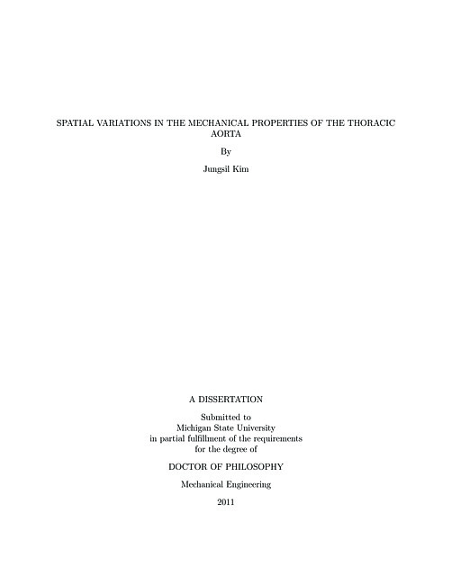 Cardiovascular disease (CVD) is the leading cause of death in the United States and a major cause of disability worldwide. A common type of vascular diseases in the U.S. is aortic aneurysm. Surgical interventions, such as open surgery or endovascular aneurysm repair (EVAR), are often required to avoid the high risk associated with aneurysm rupture. To better understand the role of biomechanics in aortic diseases and develop their clinical interventions, there is a need to understand the mechanical behavior of healthy as well as diseased aortas and their effects on aneurysm expansion and rupture potential. While it is well known that the mechanical properties of a blood vessel vary with location and age, little attention has been paid to its circumferential variations. Therefore, the goal of this study is to investigate spatial variations in the mechanical behavior of the descending thoracic aorta. Toward this end, the following has been accomplished: 1) a biaxial experimental apparatus with a stereo-vision system, which allows to track the three dimensional (3D) motion of the aorta during the inflation test, was developed, 2) the inflation tests at a fixed longitudinal stretch ratio were performed for two longitudinal portions - the proximal and distal - and four circumferential regions - the anterior, left lateral, posterior, and right lateral - of the porcine thoracic aorta, 3) stress-strain analysis were developed based on the approximation of the aortic wall surface using a set of continuous base functions in a curvilinear coordinate system, 4) the variations of stretch, stress, stiffness defined as a change in the circumferential stress corresponding to a change in the circumferential stretch, and pressure-strain elastic modulus were statistically analyzed, and 5) material parameters were estimated by a parameter estimation method using a constitutive model based on the constrained mixture approach. The experimental results showed that the posterior region was much stiffer than the anterior region. However, the physiological stiffness represented by the pressure-strain elastic modulus did not show significant difference among the circumferential regions for the proximal and distal portions of the thoracic aorta. In addition, the stress showed significant difference among the circumferential regions and the stretch was relatively uniform. In the parameter estimation, material parameters of elastin and collagen were dominant in the mechanical response, but the role of the smooth muscle seemed to be insignificant. A significant difference was found in the parameters of the elastin and collagen fiber between the anterior and posterior regions.In conclusion, this study presents an experimental method and analysis to measure local deformation of a blood vessel. Furthermore, it shows that there exist consistent spatial variations in the mechanical properties of the thoracic aorta. These findings increase our understanding of vascular mechanics and adaptation, and will eventually help to improve clinical treatments and interventions of vascular diseases.