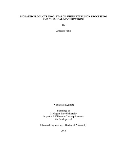 Biobased products from starch have shown great potential to replace petroleum based products and they are also environmentally friendly and biodegradable. Starch foams are one of the product forms obtained from starch and are a possible replacement for petroleum-based foams. Such foams have been prepared in the past but their sensitivity to humidity has remained a problem. Extensive research over the last few years has been focused on resolving the collapse of the foam at high humidity, improving the cushioning protection and developing an economical foaming process. However, these issues are still problematic and need to be resolved before such biobased foams can gain widespread entry into the marketplace.Initially, the effects of starch feed rate, the addition of a nucleating agent, and the extruder screw configuration were studied. It was demonstrated that screw configuration plays an important role in the extrusion process and the nucleating agent talc is an effective component with which to control the cell size. An annular die was used to extrude tubular starch foams which were then sliced to yield foam sheets suitable for cushioning protection and insulation of shipping containers. A Box-Behnken statistical design of experiment (DOE) was used to optimize the properties of the foams extruded with various additives. It was found that the density, cell structure and water sensitivity of these foams were affected by the feed rates (e.g. foam composition) of the water, talc and polyhydroxy ether (PHE). The use of PHE was found to be extremely effective in minimizing water sensitivity.Because PHE contains Bisphenol A, a suspected endocrine disrupter, another alternative polymer additive - Polyvinyl buytral (PVB) was studied. It was shown that PVB minimizes the moisture sensitivity of the foam and provided a more hydrophobic character. A statistical design experiment was used again to identify the composition and process parameters affecting the physical properties of the foams and to optimize the feed rates of the various additives. The foam extrusion process to make foam sheet was scaled down to a lab scale extruder in order to provide a more convenient technique for exploring different raw materials and formula variations.The performance (moisture adsorption, cushion curve, and thermal insulation) of the starch foam sheets under different processing conditions and compositions were evaluated. The results indicate that these foams are classified in the moderate fragile level, implying that these foams are suitable as protective packaging of network hardware equipment, personal computers and medical diagnostic apparatus. The starch sheets have similar thermal resistance, R value, compared with polystyrene foams.Finally, starch phosphate was synthesized using sodium trimetaphosphate and glycerol phosphoric acid by an extrusion method to examine its use as a possible electrorheological fluid or as a flame retardant additive.The main accomplishment of this research is a starch foam sheet with a significantly high moisture resistance that can be prepared by extrusion using readily available and affordable resin additive. The process and the composition have been used to scale up the manufacturing of these foam sheets for commercial production.