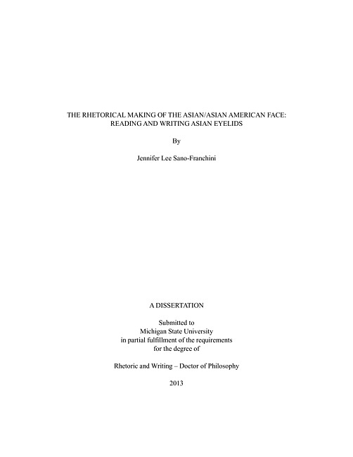 "Drawing on scholarship in and around rhetorical theory, cultural rhetorics, Asian American rhetoric, cultural studies, Asian American studies, and postcolonial theory alongside qualitative data analysis of approximately fifty videos and the numerous viewer comments that accompany them, this study is a rhetorical analysis of the discourse on East Asian blepharoplasty in online video."--Abstract.