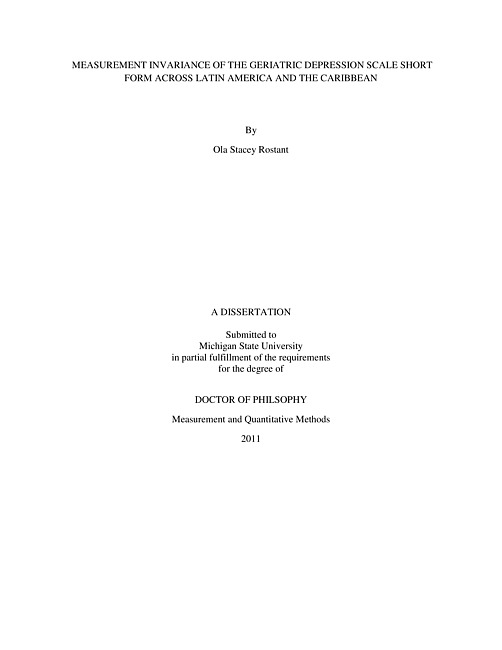 This study examined the measurement invariance of the Geriatric Depression Scale Short Form (GDS-15) in older adults across five countries in Latin America and the Caribbean. Multiple group confirmatory factor analysis (MGCFA) and item response theory likelihood ratio tests (IRTLR-DIF) were used to test the measurement invariance of the GDS-15 by gender and cross-country comparisons. The sample for this study was made up of 7,573 older adults between the ages of 60 and 102. Data for the present study comes from the Survey on Health Well-Being and Aging in Latin America and the Caribbean (SABE)(Pelaez, et al., 2004). The underlying factor structure of the GDS-15 was examined within each country. A one-factor structure was found for the countries of Chile and Cuba and a two-factor was found for the countries of Argentina, Mexico and Uruguay. Results of the multiple group confirmatory factor analysis offered support for full measurement invariance of a one-factor structure by gender within the countries of Chile and Cuba. Partial measurement invariance was found for a two-factor structure by gender within the countries of Argentina, Mexico and Uruguay by gender. The IRTLR-DIF analyses by gender and cross-country comparisons revealed a lack of parameter invariance. Items exhibiting DIF by gender were on average more difficult for men to endorse than women. In summary the IRTLR-DIF procedure identified more non-invariant items than the MGCFA procedure. Implications and recommendations for future research are addressed.
