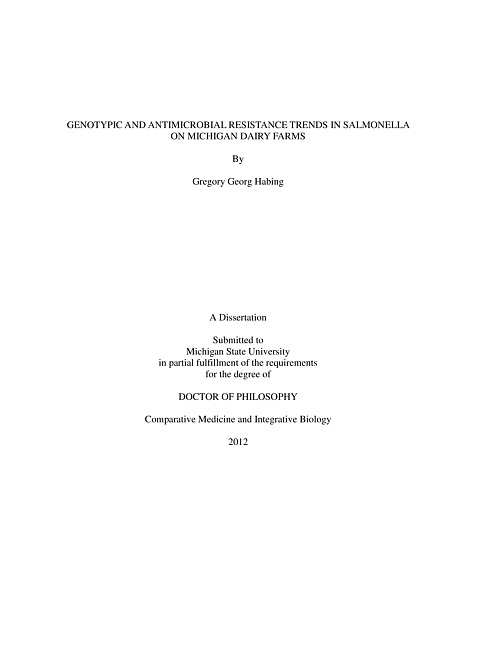 The health and welfare of cattle and humans are inextricably linked, and the momentum behind the "One Health" paradigm in veterinary and human medicine continues to grow. The linkage of livestock and human health is particularly true for zoonotic Salmonella that contaminate the human food supply. Salmonella causes the largest number of foodborne deaths and hospitalizations in the United States; livestock, including dairy farms, are a primary reservoir for those infections. Increases in the antimicrobial resistance and incidence of salmonellosis in humans have been associated with the emergence of novel Salmonella strains in livestock. Therefore, improved knowledge of the frequency and drivers for changes in the population of Salmonella on livestock farms could lead to positive impacts on public health.This study used a long-term longitudinal approach to assess changes in the prevalence, antimicrobial resistance, and genetic subtypes of Salmonella on Michigan dairy farms. The overall goal was to determine genotypic population changes that were associated with changes in the prevalence and antimicrobial resistance of Salmonella within farms. Specifically, this study addressed the following four objectives: 1) Determine within-farm changes in the antimicrobial susceptibility of Salmonella between 2000-2001 and 2009 2) Determine within-farm changes in the prevalence of Salmonella using seasonally-matched sampling visits in 2000-2001 and 2009 3) Identify the serotypes, sequence types, and PFGE banding patterns for Salmonella recovered in each time period 4) Determine the association between antimicrobial susceptibility changes and changes in the population of molecular subtypes.Results from this study suggest that the overall prevalence of Salmonella on Michigan dairy farms has increased between 2000-2001 and 2009. Increases in Salmonella prevalence were associated with increases in herd size and changes in management practices. The proportion of isolates that were resistant to multiple antimicrobials was less in 2009 relative to 2000-2001. Additionally, there were decreases in the minimum inhibitory concentrations (MICs) for nine of the 15 tested antimicrobials. Results of the sequence typing and PFGE profiles show an overall high relatedness, and long-term persistence of Salmonella within farms. Analysis of the antimicrobial resistance changes and genotypic changes suggest that downward shifts in MICs were associated with a shift in the population favoring serogroup C1. Additionally, recovery of MDR strains in 2000-2001, and susceptible strains of the same serotype in 2009 suggest displacement of MDR subtypes by susceptible subtypes.