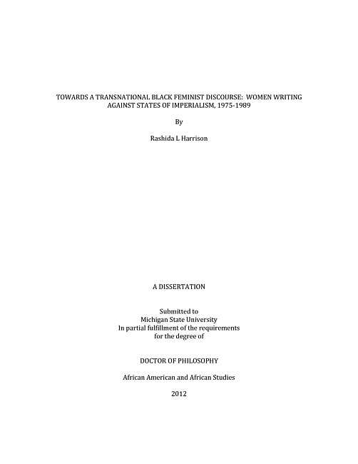 TOWARDS A TRANSNATIONAL BLACK FEMINIST DISCOURSE: WOMEN WRITING AGAINST STATES OF IMPERIALISM, 1975-1989ByRashida L HarrisonThis dissertation project aims to contribute to the current scholarship on transnational black feminisms. The project adds to the refining of nuanced theoretical approaches to specific experiences of black women. I attempt to not only codify a set of theoretical parameters, but also identify prevailing tropes within transnational black feminist discourse. I propose several tools extrapolated from my case study of black British feminist writings of the late 1970s and `80s, as well as novels written by black women writing in both U.S. and English Imperialized spaces. My purview of transnational black feminist discourse is characterized by, a multi ethnic definition of blackness, the understanding of personal identities as multi dimensional and fluid, a practice of a politics of solidarity amongst women fighting oppression globally, a distinct anti-racist and anti-imperial political agenda, and an understanding that Western imperialism creates global inequalities. I engage in close readings of four black women writers, Michelle Cliff, Joan Riley, Gayl Jones and Audre Lorde, as well as writings from two Black British collectives, the Organisation of Women of Asian and African Decent (OWAAD), and the Outwrite collective, distributers of Outwrite a Women's Newspaper. My readings result in several tropes within black women's discourse of this period, which include belonging and unbelonging, visitation and dismemberment, and what I identify as living affectivity. The writings and conscious articulations are critical for locating transnational black feminist discourse as a distinct area of theoretical inquiry.