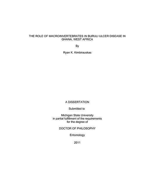 Buruli ulcer (BU) is an emerging, neglected, infectious disease most often associated with poor, rural communities within developing nations. To date, the disease has been reported from at least 32 countries, with the highest frequency of new cases being reported from the West African nations of Cote D' Ivoire, Benin and Ghana. It is known that Mycobacterium ulcerans is the pathogen responsible for causing BU disease; however, researchers have yet to conclusively identify the extent of the pathogen's distribution in the environment, the reservoir(s) of the pathogen in nature, or the mode(s) of transmission to humans. It is widely accepted that BU disease is in some way related to exposure to freshwater environments, and furthermore, it has been suggested that human activities leading to environmental disturbance increase risk of BU infection. Aquatic macroinvertebrates have been implicated as both potential reservoirs and vectors M. ulcerans infection to humans; however, field-based ecological studies to investigate the role of macroinvertebrates in BU disease have not been conducted. The purpose of this study was to: 1) characterize and compare overall macroinvertebrate communities from aquatic environments in Ghana, West Africa: 2) identify macroinvertebrate community associations with the presence and absence of M. ulcerans in aquatic environments: and 3) identify potential relationships between specific macroinvertebrates and M. ulcerans. Results from this large survey of aquatic environments in Ghana suggest that macroinvertebrate communities and individual taxa may be useful sentinels for initial identification of pathogen presence or habitat conditions associated with disease agent transmission; however, further studies are needed to elucidate the exact role of macroinvertebrates as reservoirs of M. ulcerans and potential vectors of BU.