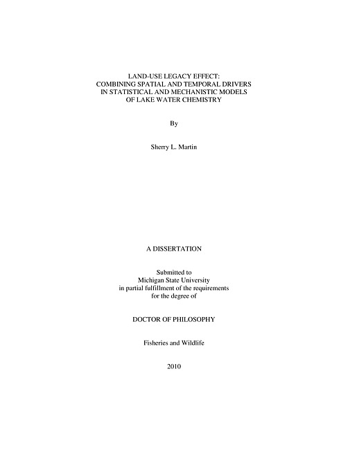 Lake Classification: A classification system is often used to reduce the number of different ecosystem types that governmental agencies are charged with monitoring and managing. We compare the ability of several different hydrogeomorphic (HGM) classifications to group lakes for water chemistry/clarity. We ask three questions: (1) Which approach to lake classification (regionalization, landscape position, lake-specific, or some combination) is most successful at classifying lakes for similar water chemistry/clarity? (2) Which HGM features are most strongly related to the lake classes? and, (3) Can a single classification successfully classify lakes for all of the water chemistry/clarity variables examined? We use classification and regression tree (CART) analysis of HGM features to classify six water chemistry/clarity variables from 151 minimally disturbed lakes in Michigan USA. We developed two CART models for each water chemistry/clarity variable: HGM characteristics alone and HGM characteristics combined with regionalizations and landscape position. The combined CART models had the highest strength of evidence (ωi range 0.92-1.00) and maximized within class homogeneity (ICC range 36-66%) for all water chemistry/clarity variables except water color and chlorophyll a. The most successful single classification in our study was on average 20% less successful in classifying other water chemistry/clarity variables. Thus, our results show that no single classification maximizes success for all lake variables examined. Therefore, we suggest that the most successful classification is (1) specific to one response variable, and (2) capable of incorporating information at multiple spatial scales and from a variety of different sources (regionalization and local HGM variables). Land use legacies: The recognition of legacy effects from historical land use/land cover (LULC) is a conceptual advance that has clarified the relationship between LULC and ecosystem responses. Legacy effects can be defined as effects which perpetuate beyond an expected or perceived endpoint in time. The goal of our research was to investigate LULC legacy effects on lake water chemistry. Water chemistry and five time steps of LULC data were collected from 35 lakes in the Huron River Watershed, Michigan. We took both a correlational and mechanistic approach to represent how temporal changes in LULC influence lake water chemistry. We used principal components of LULC over time to build hierarchical regression models linking to water chemistry. We also created a mechanistic groundwater flow model to estimate spatially-explicit groundwater travel times. The groundwater travel time was used to create a legacy LULC map for subsequent regression modeling. Our correlative models show that some water chemistry characteristics show a stronger link to legacy LULC than others and may be explained by the solubility and reactivity of the chemical. Our mechanistic models offer insights about how groundwater interacts with LULC change to create legacy effects and show how naturally occurring conservative tracers can provide a basis for comparison against nutrient relationships to the landscape. By categorizing the chemistry variables by their key characteristics of solubility and reactivity, we are better equipped to explore other mechanisms that are important for the physical transport and biogeochemical transformations of these chemicals.