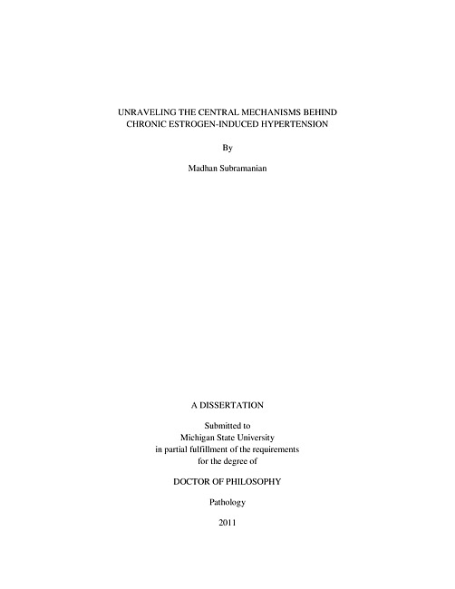 Women are exposed to estrogen in several forms including oral contraceptive pills and hormone replacement therapy. Although estrogen was originally believed to be cardioprotective, lately, its beneficial effects are being questioned. Prolonged exposure to estrogenic preparations increased the risk for cardiovascular diseases, but the mechanisms are still unknown. The paraventricular nucleus (PVN) of the hypothalamus and rostral ventrolateral medulla (RVLM) of the brainstem are two important cardiovascular centers that are well known to be involved in the central control of blood pressure (BP) regulation. My dissertation focuses on understanding the central mechanisms resulting in chronic estrogen-induced hypertension in a rat model. In my studies, chronic estradiol exposure increased arterial pressure and heart rate in female SD rats. These hypertensive effects of chronic estrogen exposure were accompanied with increased superoxide production in the RVLM. Treatment with an antioxidant reversed estradiol-induced increase in superoxide production in the RVLM and BP. Our studies also provide evidence that chronic estradiol exposure activates the endothelin-1 (ET-1) system in both the RVLM and PVN and intracerebroventricular administration of an ET-1 receptor antagonist reduced estradiol-induced increase in BP. Taken together, these findings suggest that the cardiovascular effects of estradiol may be attributed to a central component involving oxidative stress and activation of the endothelin system.