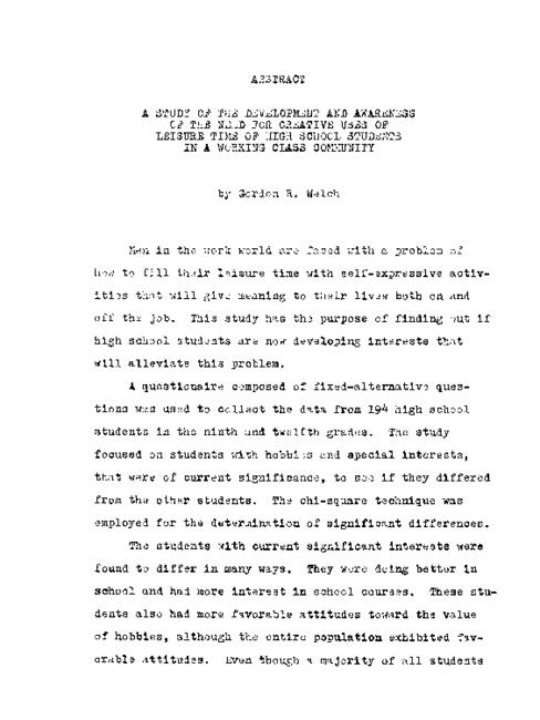 A study of the development and awareness of the need for creative uses of leisure time of high school students in a working class community
