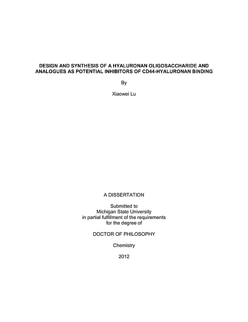 Hyaluronan (HA) is a non-sulfated negatively charged linear polysaccharide, which is composed of 2,000-25,000 repeating units of disaccharides: [-D-glucuronic acid-â-1,3-N-acetyl-D-glucosamine-â-1,4-]. Tumor microenvironment contains different type of cells and ECM. HA and HA binding proteins are the major components of extraceullular matrix (ECM). CD44 is the primary receptor for HA. CD44, a single chain transmembrane protein, is composed of four parts: the N-terminal hyaluronan binding domain (HABD), the stem domain, the transmembrane domain and the C-terminal cytoplasmic-tail domain. Multivalent HA-CD44 interactions induce signaling pathways that promote tumor cell invasiveness, proliferation, survival and multidrug resistance (MDR). Multivalent HA-CD44 interactions are required for formation of constitutive signaling complexes. Replacement of the multivalent interactions with monovalent interactions by the treatment with hyaluronan oligosaccharide (sHA) causes disassembly of constitutive signaling complexes and attenuated signaling pathway. These finally lead to the inhibition of tumor cell proliferation and MDR. In this dissertation, the chemical synthesis of a hyaluronan decasaccharide (HA10) using the pre-activation based chemoselective glycosylation strategy is described. Assembly of large oligosaccharides is generally challenging due to the increased difficulties in both glycosylation and deprotection. Indeed, the same building blocks previously employed for hyaluronan hexasaccharide (HA6) synthesis failed to yield the desired HA10. After extensive experimentation, the HA10 backbone was successfully constructed with an overall yield of 37% from disaccharide building blocks. The trichloroacetyl group was used as the nitrogen protective group for the glucosamine units and the addition of trimethylsilyl triflate (TMSOTf) was found to be crucial to suppress the formation of trichloromethyl oxazoline side-product and enable high glycosylation yield. For deprotections, the combination of a mild basic condition and the monitoring methodology using 1H-NMR allowed the removal of all base-labile protective groups, which facilitated the generation of the fully deprotected HA10. Based on the co-crystal structure of CD44 HABD and hyaluronan octasaccharides (HA8), hyaluronan pentasaccharide (HA5) analogues were designed and synthesized. Due to synthetic difficulties, the initial design of Library A was abolished. By rotating S-C4 bond, new analogues, Library B and Library C, were generated. Eleven compounds in Library B and Library C were synthesized by a cutting edge method, and screened by inhibitory Enzyme-linked immunosorbent assay (ELISA). Finally, it was found that the aromatic group in analogue 56 contributes to the binding of 56 to CD44. And this interaction overcomes the loss of favorable enthalpy caused by the loss of H-bonds from COOH of glucronic acid 7 (GluUA7) and primary OH of N-Acetylglucosamine 8 (GlcNAc8). Although the binding affinity of 56 is only comparable to HA6 and less than HA8, this provides a new direction towards further design of novel HA inhibitors.