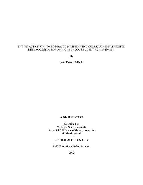 ABSTRACTTHE IMPACT OF STANDARDS-BASED MATHEMATICS CURRICULA IMPLEMENTED HETEROGENEOUSLY ON HIGH SCHOOL STUDENT ACHIEVEMENT ByKari Krantz SelleckThis study examined the impact of standards-based mathematics curricula developed by the National Science Foundation, implemented within heterogeneously grouped, de-tracked high school classrooms. Four purposefully selected cohorts of high school students participated over a period of eight years. Outcome measures included two coursework measures (maximum difficulty level of math courses in which students enrolled and total number of math courses enrolled in during high school), and standardized state-level high school test results. Hierarchical regressions conducted on the sample as a whole showed no significant differences among the cohorts for the highest level of math course taken. The trends were that students in Cohort 2 (the first post-reform cohort) took slightly lower-level math courses than students in Cohort 1 (pre-reform), there was then a slight increase in Cohort 3, and finally, students in Cohort 4 took slightly higher-level math courses than students in Cohort 1. Regarding the number of courses taken, students in Cohorts 2 and 3 took fewer math courses than students in Cohort 1, and students in Cohort 4 took approximately the same number of math courses as students in Cohort 1. The results for Cohorts 2 and 3 were significant. There were negative, significant differences, although slight, for standardized tests. In other words, students post-reform performed slightly but significantly worse on standardized tests than students pre-reform. Further hierarchical regressions on the highest and two lowest-achieving quartiles (based on incoming eighth-grade state test results) showed that students at the highest proficiency level within the three post-reform cohorts fared slightly worse than those in the pre-reform cohort (-1.35, -.84, -.67) for highest level math course with Cohort 2 significant (0.36). Highest achieving students performed worse on standardized tests with Cohort 3 and 4 significant (both at p=.001) Students in the lowest proficiency levels across all post-reform cohorts fared better than the pre-reform cohort in terms of level of math courses. Low-performing students in the fourth cohort (strongest treatment group) took math courses nearly two-thirds (.62) of a difficulty level higher than students in the pre-reform cohort, and this result was significant (p = .010). New state math course-taking requirements along with changes in content and scale scores of the state assessments during this longitudinal study posed limitations to the study. Implications for national and state mathematics policy included.