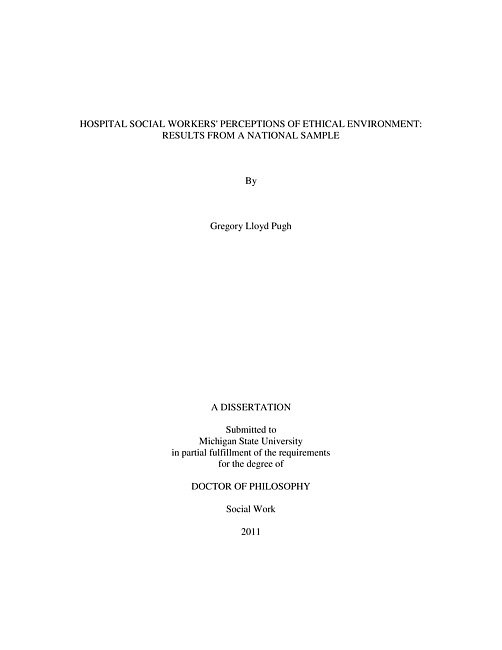 Hospital social workers are in the unique position of being one of the only non-medical professions working in the hospital setting. This raises some interesting challenges in hospital social work practice, especially when it comes to professional ethics. The medical model of ethical reasoning is different from social work models, and the medical model contributes a great deal to the overall Ethical Environment in a hospital. Ethical Environment is a new concept for hospitals to consider and has only recently been explored, almost exclusively with samples of nurses. Ethical Environment includes the hospital practices and resources directed at ethical issues and is thought to affect ethical practices and behaviors. The research suggests that a number of personal, professional, and organizational factors may influence perceptions of Ethical Environment. The hospital social work and ethics literature also suggests relationships between some of the same factors and the ethical practices and behaviors of social workers, but has not considered Ethical Environment. Both the nursing and social work literature suffer from a lack of large, representative samples. This study was designed to explore the relationships between personal, professional, and organizational variables and perceptions of hospital Ethical Environment among social workers in a large, nationwide, representative sample. The study succeeded in collecting a sample of 973 social workers from 290 hospitals in a random closed population cluster sample across 40 States. The participants completed an online survey questionnaire about the Ethical Environment of their hospitals, and resulted in hospital social workers rating the Ethical Environment significantly higher than nurses. Significant predictors of the rating of Ethical Environment are based primarily on job satisfaction, with some contributions from years of service, attendance at hospital-based ethics education programs, and a centralized social work department configuration. Social workers also rate the environment of for-profit hospitals greater than non-profit hospitals. Results indicate that larger hospitals with greater resources directed at ethics provide the best Ethical Environment for social workers. Professional social work ethics education and training was not predictive, which raises questions about the content and methods of teaching social work ethics.
