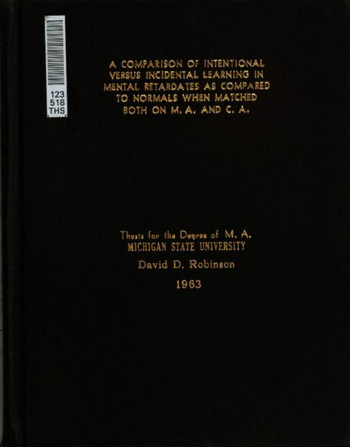 A comparison of intentional versus incidental learning in mental retardates as compared to normals when watched both on M.A. and C.A
