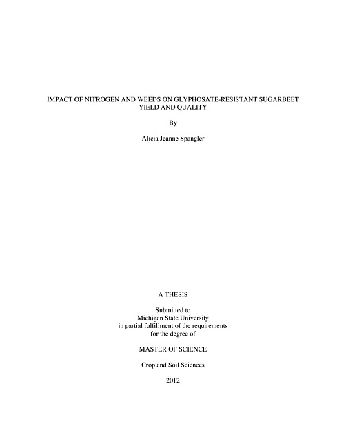 "The commercialization of glyphosate-resistant sugarbeet has changed weed management in sugarbeet. Many growers are delaying their initial herbicide application because glyphosate can control larger weeds, which allows weeds to compete with crops for nutrients. Greenhouse and field experiments were conducted to examine the effect of nitrogen (N) rate and the competitive ability of weeds on glyphosate-resistant sugarbeet."--From abstract.