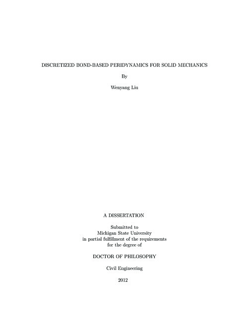 The numerical analysis of spontaneously formed discontinuities such as cracks is a long-standing challenge in the engineering field. Approaches based on the mathematical framework of classical continuum mechanics fail to be directly applicable to describe discontinuities since the theory is formulated in partial differential equations, and a unique spatial derivative, however, does not exist on the singularities. Peridynamics is a reformulated theory of continuum mechanics. The partial differential equations that appear in the classical continuum mechanics are replaced with integral equations. A spatial range, which is called the horizon, is associated with material points, and the interaction between two material points within a horizon is formed in terms of the bond force. Since material points separated by a finite distance in the reference configuration can interact with each other, the peridynamic theory is categorized as a nonlocal method.The primary focus in this research is the development of the discretized bond-based peridynamics for solid mechanics. A connection between the classical elasticity and the discretized peridynamics is established in terms of peridynamic stress. Numerical micromoduli for one- and three-dimensional models are derived. The elastic responses of one- and three-dimensional peridynamic models are examined, and the boundary effect associated with the size of the horizon is discussed. A pairwise compensation scheme is introduced in this research for simulations of an elastic body of Poisson ratio not equal to 1/4. In order to enhance the computational efficiency, the research-purpose peridynamics code is implemented in an NVIDIA graphics processing unit for the highly parallel computation using a high-level implicit programming model. Numerical studies are conducted to investigate the responses of brittle and ductile material models. Stress-strain behaviors with different grid sizes and horizons are studied for a brittle material model. A comparison of stresses and strains between finite element analyses and peridynamic solutions is performed for a ductile material. To bridge material models at different scales, a multiscale procedure is proposed.An approach to couple the discretized peridynamics and the finite element method is developed to take advantage of the generality of peridynamics and the computational efficiency of the finite element method. The coupling of peridynamic and finite element subregions is achieved by means of interface elements. Two types of coupling schemes, the VL-coupling scheme and the CT-coupling scheme respectively, are introduced. Numerical examples are presented to validate the proposed coupling approaches including one- and three-dimensional elastic problems and the mixed mode fracture in a double-edge-notched concrete specimen.A numerical scheme for the contact-impact procedure ensuring compatibility between a peridynamic domain and a non-peridynamic domain is developed. A penalty method is used to enforce displacement constraints for transient analyses by the explicit time integration. In the numerical examples, the impact between two rigid bodies is examined to validate the contact algorithm. The ballistic perforation through a steel plate is investigated, and the residual velocities of the projectile are compared with the results by an analytical model.Peridynamics is applied to study porous brittle materials. An algorithm is developed to generate randomly distributed cubic voids and spherical voids for a given porosity. The material behaviors at the macroscopic level including the resultant Young's modulus and the strength are studied with varying amounts of porosities. The degradations of Young's modulus and strength are compared with empirical and analytical solutions.