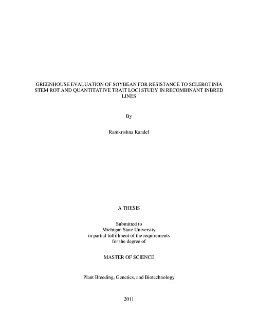 Sclerotinia stem rot [caused by Sclerotinia sclerotiorum (Lib) de Bary] is an economically important disease of soybean [Glycine max (L.) Merr] and no soybean cultivars show complete resistance to the disease. To screen soybean cultivars and lines for resistance to this disease, three related but independent studies were conducted in the greenhouse and laboratory. In the first study, 392 F4:6 recombinant inbred lines (RILs) from seven populations were evaluated for resistance to S. sclerotiorum by drop- and spray-mycelium methods under the greenhouse conditions. Individual lines in two of seven populations evaluated by drop-mycelium method were significantly different (P<0.0500). Parental polymorphism was tested with 132 simple sequence repeat (SSR) markers associated with Sclerotinia stem rot resistance in other studies and 97 polymorphic markers were used to test the progenies from the seven populations. Sixteen markers showed high correlations with the phenotypic data in the seven populations. In the second study, 66 plant introductions (PIs) were evaluated with the drop-mycelium method and significant (p < 0.0050) differences were found among the PIs for resistance to Sclerotinia stem rot. In the third study, drop-mycelium, spray-mycelium, and field evaluation methods were compared in terms of correlation of the data. The data from drop-mycelium inoculation had strong correlations with that from spray-mycelium (R2 = 0.63, P< 0.0005) and field evaluations (R2 = 0.40, P<0.0381) for resistance to Sclerotinia stem rot.
