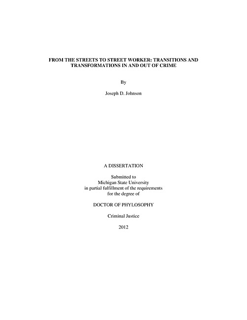 ABSTRACTFROM THE STREETS TO STREET WORKER: TRANSITIONS AND TRANSFORMATIONS IN AND OUT OF CRIME By Joseph D. JohnsonThis study examines the criminal desistance processes of the One Vision One Life (OVOL) street gang workers (N = 45) and the role that OVOL violence prevention work and/or any other factors play in this process. Through an ethnographic research design utilizing multiple methodologies, the purpose of this study was then to understand the street gang workers past personal and criminal experiences, the challenges they face upon their violence prevention employment with OVOL, and the strategies that they adopt to successfully or unsuccessfully desist from crime. The findings reveal that while OVOL employment is an opportunity for legitimate work, the general reality for street workers is that this type of work is not only dangerous but that the organization also lacks a level of structure, resources, and training for its employees. Therefore, desistance through OVOL employment and work is declared by only a small subsample of the street workers who participated in this study, and these street workers specifically express that the OVOL Director offered them employment and work at the right-point-in-time in their lives--thus serving as a sort of intervention for them. The majority of the street workers then contend that it was their personal agency or will to give up crime, and, coupled with and compounded by OVOL employment and work, that they made a personal commitment to the desistance process.