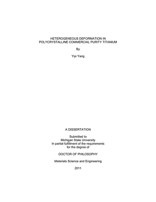 Heterogeneous deformation is commonly viewed as a precursor to damage nucleation. Only if the heterogeneous deformation is reliably modeled can location where cracks form be properly predicted. In this research project, commercial purity titanium (hexagonal close-packed (hcp) metal) has been used as a model material to study different scales of heterogeneous deformation in four-point bending specimens and fatigued-to-crack specimens. A series of comprehensive experimental and modeling methods have been conducted to characterize the heterogeneous deformation within different microstructure patches. Heterogeneous deformation within a microstructure patch was quantified by a new combined technique using atomic force microscopy (AFM), backscattered electron (BSE) imaging, and electron-backscattered diffraction (EBSD). Local shear distribution maps derived from z-displacement data of slip steps and/or twins measured by AFM were directly compared to results of a crystal plasticity finite element (CPFE) simulation that incorporates a phenomenological model of the deformation processes to evaluate the ability of the CPFE model to match the experimental observations. The CPFE model successfully predicted most types of active dislocation slip systems within the grains at the correct magnitudes, but the spatial distribution of the strains within grains differed between the measurements and the simulation. Since the difficulty of directly measuring the critical resolved shear stress (CRSS) of different deformation systems in titanium is a major cause of the deficiency of the match between CPFE modeling results and experimental measurements, nano-indentation technique is introduced to help study the values of CRSS and saturation resistance of different deformation systems for commercial purity titanium. Arrays of conical nano-indentations were performed on patches of grains. AFM scans and EBSD measurements on the patches indicate that the surface pile-up topography was strongly crystallographically dependent. By optimizing the modeling results of the nano-indentation behavior in different grains, a more reliable set of values for CRSS and saturation resistance has been determined using a non-linear optimization procedure. On a larger scale, a novel approach including BSE imaging and discrete Fourier transformation (DFT) processing is established to determine plastic zone shape and to measure plastic strain distribution within the plastic zone around a fatigue crack tip. The measured plastic zone size is in good correlation with the theoretically predicted zone sizes. This approach also holds promise to measure local heterogeneous deformation in other kinds of deformed samples. This work has helped identity the needs for future experiments focused on the observation of dislocation activity near grain boundaries using ECCI, and a statistical study on the relationship of heterogeneous deformation in neighboring grains and damage nucleation at grain boundaries. Future simulation work should focus on developing a more comprehensive CPFE model, considering the information of slip/twin transfer and grain boundaries resistance, in order to simulate heterogeneous deformation within grain patches more reliably.