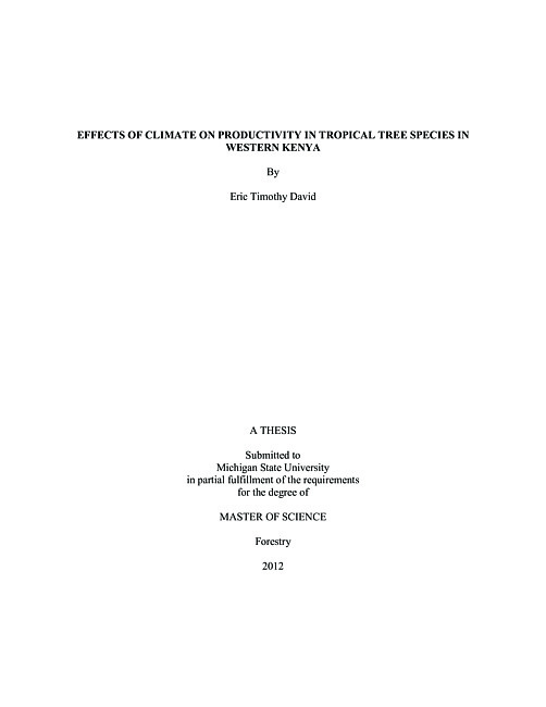 The dendrochronological potential of various tropical tree species was determined and then cumulative growth trajectories for diameter and above ground biomass were created for species of sufficient sample size (n > 2). The species with the highest dendrochronological potential included Cupressus lusitanica, the Eucalyptus spp. and Mangifera indica. The three fastest growing species in the study, based on annual diameter increment, were Eucalytus camaldulensis, Eucalyptus grandis, and Acacia mearnsii . In terms of annual biomass production, the three species that grew most rapidly were Eucalyptus camaldulensis, Mangifera indica, and Acacia mearnsii. Growth-climate relationships were examined for Acacia mearnsii, Cupressus lusitanica, Eucalyptus camaldulensis, Eucalyptus grandis, Eucalytus saligna, Mangifera indica, and Markhamia lutea. Standardized basal area increments were run through a correlation analysis with climate data obtained from nearby meteorological stations to determine if any growth responses to environmental factors existed. Both positive and negative correlations between growth and climate parameters (precipitation, temperature, climate moisture index) were found for many of study species. However, correlations among species did not present a clear pattern. A majority of the precipitation correlations were positive and the temperature correlations were negative.