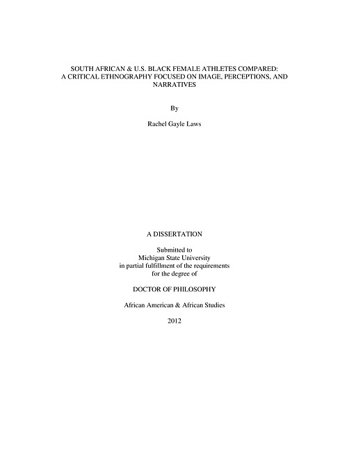 ABSTRACTSOUTH AFRICAN & U.S. BLACK FEMALE ATHLETES COMPARED: A CRITICAL ETHNOGRAPHY FOCUSED ON IMAGE, PERCEPTIONS, AND NARRATIVES By Rachel Gayle Laws An athlete is a human being that participates in some form of organized sports competition as an amateur or professional, at local, national, or international levels .The historical and present experience of the Black female athlete is not the same as her male counterpart. This is a comparative case study that critically examines the past and present state of the Black female athlete in the United States and South Africa, primarily within the 1990s and early 2000s, focusing on image, perceptions, and narratives. Unique and interdisciplinary, this study draws upon oral interviews, archival research, images, and cinematic and literary theory and analysis. Much can be gained from a comparative pairing of Black women's lives at a specific historical moment using a particular method of analysis. Ultimately, this project argues that the ideological beliefs and values of white supremacy--the doctrine that places the White race as superior to all other races, but especially the Black race--in South Africa and the U.S. has shaped the (under)development, image, and daily experiences of their Black female athletes. For both Americans and South Africans, this study should be especially illuminating because it allows each country to view each other's gendered, racial, and class issues through the lens of their own female athletes' experiences, images, and narratives. I aim to present and challenge the acceptance of the current perceptions and imagery surrounding the Black female athlete, and unearth and identify the shared experiences and narratives of these athletes in the U.S. and South Africa; a connection that has not yet been explored through scholarship. The significance of this study lies in its implications for the construction of a new voice, vision, and theoretical framework for a group of women athletes who have largely been ignored, forgotten, and oppressed by two similar, yet distinct nations. Additionally, this study has the power to spark a deeper appreciation and investigation into the power of biographical and autobiographical narratives produced by athletes themselves, as most famous athletes' stories are presented to the public via secondary and tertiary interpretations. It is important to allow Black female athletes the vital space in which to define for themselves the contours of their experiences, aspirations, and opinions. The chapters of this study explore a wide-range of issues, relationships, themes, and theories concerning modes of understanding and analyzing Black female athletes and their role within the sports world and society in general. Significant historical periods and events, Black-White race relations, media and visual modes of cultural production, perceptions, and narratives, are presented and analyzed. The concluding chapter of this study offers insight into the future state of Black female athletes specifically and female athletics generally, in the United States and South Africa.