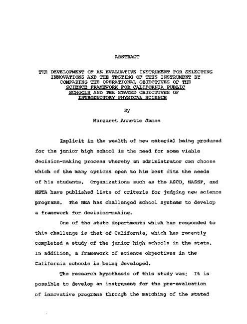 The development of an evaluative instrument for selecting innovations and the testing of this instrument by comparing the operational objectives of the Science Framework for California Public Schools and the stated objectives of Introductory Physical S...