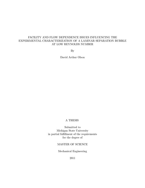 There is an immediate and evolving need for Micro Air Vehicles (MAVs) in both the defense and civilian industry. The applications for these very small (bird and insect sized), remotely operated or autonomous vehicles range from reconnaissance to remote hazardous material identification. The fundamental fluid mechanics of these small aerial vehicles, operating at low speeds, are not yet fully understood. One particular issue is a documented discrepancy in the characteristics of the laminar separation bubble on airfoils obtained from various experimental and computational studies at Reynolds numbers typical of MAV operation. The influence of added freestream turbulence, among other facility-dependent issues, is studied for a range of chord Reynolds numbers (2 × 104 – 6 × 104), and angles of attack (0° – 11°). The baseline flow is compared against the flow with added freestream turbulence using single-component Molecular Tagging Velocimetry (1c-MTV) with a cross-stream spatial resolution of 52 μm. An increase in freestream turbulence is shown to decrease the size of the separation bubble, both by delaying separation and triggering an earlier reattachment. Increased freestream turbulence is also characterized by a reduction in the height of the reversed flow region, and a decrease in the streamwise velocity fluctuations downstream of separation. The experimental characterization of the separation bubble is also found to be sensitive to near-wall spatial resolution. The introduced bias error shortens the measured bubble length and is dependent on the shape of the separation bubble.