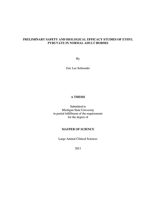 The liberation of endotoxin from gram negative bacteria plays a critical role in stimulating mononuclear cells. This leads to the cleavage of the inhibitory protein I&kappaB from the cytosolic protein NF&kappaB resulting in the translocation of NF&kappaB into the nucleus of the cell culminating in up regulation of both transcription and translation of protein. The protein from the nucleus is transformed by the endoplasmic reticulum to form both pro-inflammatory and anti-inflammatory cytokines and eicosanoids (leukotreines and prostaglandins). Mortality from sepsis in people approaches 40%. Endotoxemia causes significant morbidity in horses, including laminitis, ileus and coagulopathy. Despite current medications and fluid therapy, horses and people succumb to sepsis and endotoxemia. The search for new therapies to treat sepsis led to investigations using pyruvate derivatives. Ethyl pyruvate mitigated the cardiovascular effects of sepsis in multiple preclinical models including rodents, sheep, and swine. Ethyl pyruvate may be a novel treatment for endotoxin induced sepsis in the horse. The goal of this thesis is to provide a review of the current literature relevant to the use of ethyl pyruvate in preclinical models of sepsis and gastrointestinal ischemia and to present the data supporting ethyl pyruvate as both a safe and biologically active drug in normal adult horses.