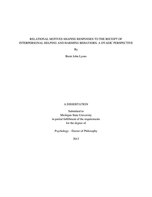 "This dissertation investigates outcomes of interpersonal helping and harming from a dyadic relationship perspective and examines how outcomes of helping and harming vary within relationships over time. Three within-relationship processes are examined to explain how the receipt of help and harm can relate to the engagement of help and harm and relationship satisfaction: social exchange, affective events, and self-regulation. Social motives at the relationship level of analysis are hypothesized to influence the within-relationship processes."--From abstract.