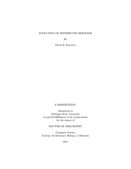 In this dissertation, we describe a study in the evolution of distributed behavior, where evolutionary algorithms are used to discover behaviors for distributed computing systems. We define distributed behavior as that in which groups of individuals must both cooperate in working towards a common goal and coordinate their activities in a harmonious fashion. As such, communication among individuals is necessarily a key component of distributed behavior, and we have identified three classes of distributed behavior that require communication: data-driven behaviors, where semantically meaningful data is transmitted between individuals; temporal behaviors, which are based on the relative timing of individuals' actions; and structural behaviors, which are responsible for maintaining the underlying communication network connecting individuals. Our results demonstrate that evolutionary algorithms can discover groups of individuals that exhibit each of these different classes of distributed behavior, and that these behaviors can be discovered both in isolation (e.g., evolving a purely data-driven algorithm) and in concert (e.g., evolving an algorithm that includes both data-driven and structural behaviors). As part of this research, we show that evolutionary algorithms can discover novel heuristics for distributed computing, and hint at a new class of distributed algorithm enabled by such studies.The majority of this research was conducted with the Avida platform for digital evolution, a system that has been proven to aid researchers in understanding the biological process of evolution by natural selection. For this reason, the results presented in this dissertation provide the foundation for future studies that examine how distributed behaviors evolved in nature. The close relationship between evolutionary biology and evolutionary algorithms thus aids our study of evolving algorithms for the next generation of distributed computing systems.