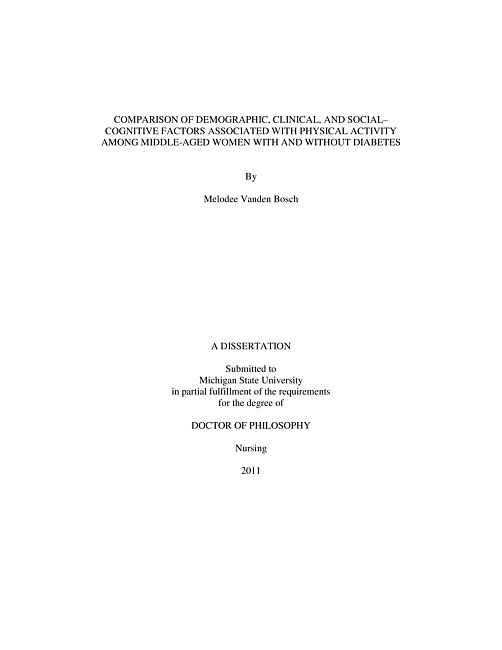 Background: Middle-aged women are at high risk for diabetes and cardiovascular disease. Despite the known benefits, 80% of middle-aged women do not meet the physical activity recommendations, especially those with diabetes. The U.S. Department of Health and Human Services recommendation for middle-aged women includes 150 minutes per week of moderate-intensity or 75 minutes per week of vigorous-intensity aerobic physical activity or an equivalent combination of moderate- and vigorous-intensity physical activity (MVPA) spread throughout the week. While appropriate interventions are needed to increase physical activity in middle-aged women with and without diabetes, there is little information about the differences in demographic, clinical, and social-cognitive factors associated with MVPA between these two groups of women. Framework: The conceptual framework for this study, the Behavioral Model of Physical Activity, was based on Social Cognitive Theory and the Theory of Planned Behavior and the demographic, clinical and social-cognitive factors found to be associated with physical activity in the literature. Purpose: The primary purpose of the study was to explore the demographic, clinical, and social-cognitive factors associated with minutes per day of MVPA in middle-aged women with and without diabetes and to compare the two groups on these factors and their MVPA. A secondary purpose was to determine the degree of agreement between a self-report measure, the International Physical Activity Questionnaire (IPAQ) short form, and accelerometry for measuring minutes per day of MVPA. Research Questions: What were the differences between middle-aged women with and without diabetes in their minutes per day of MVPA as measured by the two physical activity measures and their associated demographic, clinical, and social-cognitive factors? What was the degree of agreement in minutes per day of MVPA between the IPAQ short form and the accelerometer? Which demographic, clinical and social-cognitive factors of middle-aged women with and without diabetes were associated with minutes per day of MVPA as measured by the (a) IPAQ short form, and (b) accelerometer? Sample and Setting: Women, 42 with diabetes and 67 without diabetes, between the ages of 45 and 64, were recruited from four urban primary care clinics. Women who fulfilled the inclusion criteria met individually with the investigator at an initial clinic appointment to complete a paper-and-pencil survey and to obtain height and weight. Each woman was provided with an accelerometer and a daily log to complete during the wear-time. During a second clinic appointment with the investigator, the women returned the accelerometer and daily log and completed the IPAQ short version. Results: The majority of women were overweight or obese (n = 93, 86.1%). Women with diabetes had fewer minutes per day of vigorous physical activity than women without diabetes. Middle-aged women with diabetes were more likely to be non-White and have higher body mass index (BMI), higher comorbidity index, lower perceived benefits of physical activity, and lower physical activity self-efficacy than those without diabetes. Minutes per day of MVPA in the women were negatively associated with educational level, BMI, and depressive symptom severity. Implications: Nursing interventions through increased MVPA are needed to decrease high rates of overweight and obesity in middle-aged women with and without diabetes. Nursing strategies targeted toward enhancing perceived benefits of physical activity and physical activity self-efficacy may be promising for achieving this objective for middle-aged women with diabetes.