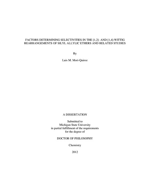 ABSTRACTFACTORS DETERMINING SELECTIVITIES IN THE [1,2]- AND [1,4]-WITTIG REARRANGEMENTS OF SILYL ALLYLIC ETHERS AND RELATED STUDIESByLuis M. Mori-QuirozThe [1,4]- and [1,2]-Wittig rearrangements of acyclic alpha-silyl and alpha,gamma-disilyl allylic ethers have been studied. Structural and electronic modifications have been introduced to learn the effect that they produce in the [1,4]-/[1,2]-selectivity and diastereoselectivities in some cases. These acyclic substrates in general reacted sluggishly, and therefore most of these reactions show important limitations in term in efficiency and selectivities.In a similar way, the [1,4]- and [1,2]-Wittig rearrangements of 2-silyl and 4-silyl 5,6- dihydropyrans have been explored, resulting in the discovery of an overall efficient isomerization to cyclopropylsilanes or silyl cyclopentenol structures. The [1,4]-/[1,2]-selectivity can be determined by proper structural and/or electronic modifications at the migrating group or at the allylic portion. The silyl group has been determinant in allowing clean isomerization, presumably due to an electronic contribution, but its steric demand also played a key role in determining the [1,4]-/[1,2]-selectivity and diastereoselectivities of these isomerizations.The rearrangement of cyclic ethers has been expanded to more complex (bisallylic) substrates, with similar efficiency and selectivities, but larger or shorter rings showed lower reactivity, selectivity and overall efficiency. Comparison with non-silylated analogues provides a better picture of the contribution of silyl groups in these isomerizations.