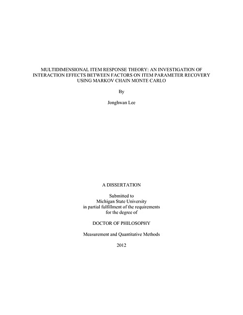 ABSTRACTMULTIDIMENSIONAL ITEM RESPONSE THEORY: AN INVESTIGATION OF INTERACTION EFFECTS BETWEEN FACTORS ON ITEM PARAMETER RECOVERY USING MARKOV CHAIN MONTE CARLOByJonghwan LeeIt has been more than 50 years since Lord (1952) published "A Theory of Test Scores (Psychometric Monograph No.7)" which is recognized as one of the most influential in Item Response Theory (IRT) history. Since then, there has been extensive research investigating several aspects of IRT such as: (1) Modeling; (2) Estimation of latent traits; and (3) Estimation of item parameters. There has also been extensive development of applications based on IRT such as (1) Equating; (2) Linking; (3) Differential Item Function (DIF); (4) Standard setting; and others. All those applications have the same assumption--that the item parameters are calibrated as accurately as possible. Nevertheless, there has been extensive research investigating the techniques to estimate the item and latent trait parameters. All previously developed estimation techniques are based on the uni-dimensional IRT model. However, estimation procedures have become more sophisticated because of the appearance of multidimensional item response theory models (MIRT). In MIRT, there are several factors that are influential in calibration procedures, such as (1) number of latent traits; (2) correlation between the latent traits; (3) non-normal distribution of latent traits; and (4) different types of configurations of latent traits (approximate simple structure and mixed structure). In this study, the interaction effects of combined factors on item parameter recovery were investigated using the Markov Chain Monte Carlo simulation method. The findings show that a higher number of dimensions require a bigger sample size than lower dimensions--2000 and 1000 sample sizes for 6-dimensions and 3-dimensions, respectively. That model does not consider correlation and skewness in the latent trait distribution, however. This study shows that if there is an additional factor introduced into the features of the latent trait such as correlation or skewness, increasing the sample size is not helpful in improving the accuracy of item parameter recovery. Rather, an alternative MIRT model should be considered in the case of correlated latent traits, and for transforming non-normal distributions of latent traits to normal distributions. a-parameters are more affected when there is correlation between latent traits. d-parameters have more influence when the latent trait distribution is skewed. Overall, the more factors that influence the estimation of the parameters of the MIRT model, the higher the bias found in the item parameter calibration. If the latent structures are independent and normally distributed, then the higher the dimension is in the model specification, the less bias it will have in item parameter calibration. It is also true that if the latent structures have different types configuration, such as AS or MS, then increasing the number of dimensions may possibly decrease the bias created from different types of latent structures configuration. When the latent traits are suspected of having a skewed or non-normal distribution, then it bias is not improved by simply increasing the sample size, though it might be helpful to increase the number of items at the same time. Another way to fix this problem is to use a sample of examinees selected from a wide range of abilities. This is also true in the case of latent traits that are correlated with each other. Selecting the examinee group carefully greatly reduces the bias resulting from the item calibration procedure.