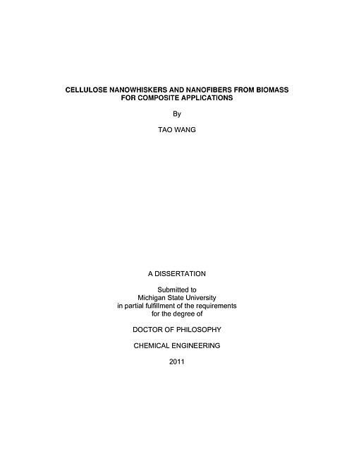 Biological nanocomposites such as plant cell wall exhibit high mechanical properties at a light weight. The secret of the rigidity and strength of the cell wall lies in its main structural component - cellulose. Native cellulose exists as highly-ordered microfibrils, which are just a few nanometers wide and have been found to be stiffer than many synthetic fibers. In the quest for sustainable development around the world, using cellulose microfibrils from plant materials as renewable alternatives to conventional reinforcement materials such as glass fibers and carbon fibers is generating particular interest. In this research, by mechanical disintegration and by controlled chemical hydrolysis, both cellulose nanofibers and nanowhiskers were extracted from the cell wall of an agricultural waste, wheat straw. The reinforcement performances of the two nanofillers were then studied and compared using the water-soluble polyvinyl alcohol (PVOH) as a matrix material. It was found that while both of these nanofillers could impart higher stiffness to the polymer, the nanofibers from biomass were more effective in composite reinforcement than the cellulose crystals thanks to their large aspect ratio and their ability to form interconnected network structures through hydrogen bonding.One of the biggest challenges in the development of cellulose nanocomposites is achieving good dispersion. Because of the high density of hydroxyl groups on the surface of cellulose, it remains a difficult task to disperse cellulose nanofibers in many commonly used polymer matrices. The present work addresses this issue by developing a water-based route taking advantage of polymer colloidal suspensions. Combining cellulose nanofibers with one of the most important biopolymers, poly(lactic acid) (PLA), we have prepared nanocomposites with excellent fiber dispersion and improved modulus and strength. The bio-based nanocomposites have a great potential to serve as light-weight structural materials for automotive, medical, and other applications.