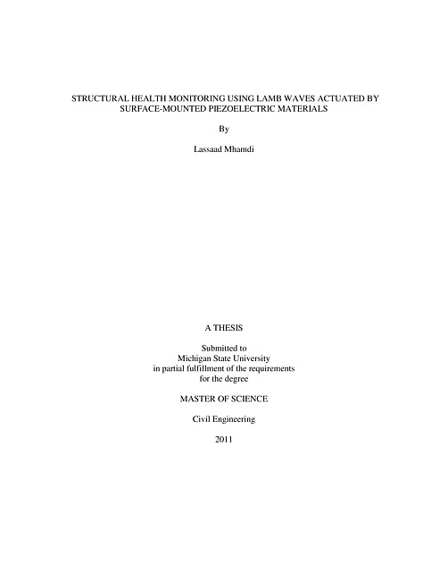 ABSTRACTPiezoelectric materials have gained wide acceptance in the world and have been successfully used in a myriad of applications (industrial, engineering, etc.) thanks to their potential and ability of electromechanical conversion. The research in this thesis focuses on exploring the capabilities of surface-mounted piezoelectric (PZT) patches in exciting and detecting lamb waves in order to assess the integrity of a sample of aluminum plates. Therefore, numerical and analytical formulations of the impedance of an unbonded PZT patch were conducted and two different S.H.M techniques: the ultrasonic nondestructive technique of pitch-catch and the traditional technique of phased arrays were studied. First, a free PZT patch was modeled both analytically and numerically in order to see how its impedance varies depending on its mechanical parameters. The modeling can help understanding the electromechanical behavior of the patch and control its quality before using it in SHM tasks. Second, the technique of pitch catch was used in order to study the effect of crack depth on the propagation of lamb waves. For this reason, experiments on aluminum plates with defects of variable depths were conducted and results show significant variations of the energy of the wave as function of the crack depth. Finally, the technique of phased arrays, using a linear array of piezoelectric patches, was investigated in order to focus the lamb waves in specific directions and enhance the detection of small notches manufactured in the aluminum plates. Results showed that the simple phased array made of six simple piezoelectric transducers was able to detect the notches predefined on the aluminum plates.