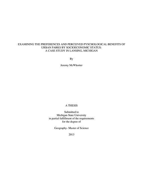 Examining the preferences and perceived pyschological benefits of urban parks by socioeconomic status : a case study in Lansing, Michigan
