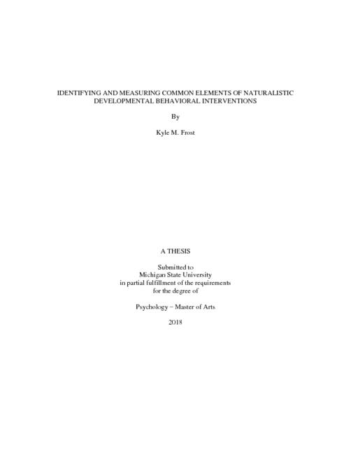 "Evidence-based interventions for young children with autism spectrum disorder (ASD) share theoretical origins in developmental and behavioral theories, and have been acknowledged to share key strategies (Schreibman et al., 2015). However, the extent to which these interventions share strategies has not been examined in research to date. In addition, there is no standardized measure for assessing intervention implementation that was developed for use across different interventions. This paper presents two studies, the first of which had the goal of developing a comprehensive taxonomy of strategies of caregiver-mediated NDBI and refining an observational rating scheme using quantitative feedback from experts. Twenty strategies comprised the comprehensive taxonomy, 11 of which were determined to be common elements using quantitative methods. From these items, an 8-item observational rating scheme, the NDBIFi, was developed. The goal of study two was to establish preliminary reliability and validity of the NDBI-Fi, by rating caregiver-child interaction videos from various completed intervention trials. Results lend support to the utility of the NDBI-Fi as a measure of caregiver use of intervention strategies across NDBI models."--Page ii.