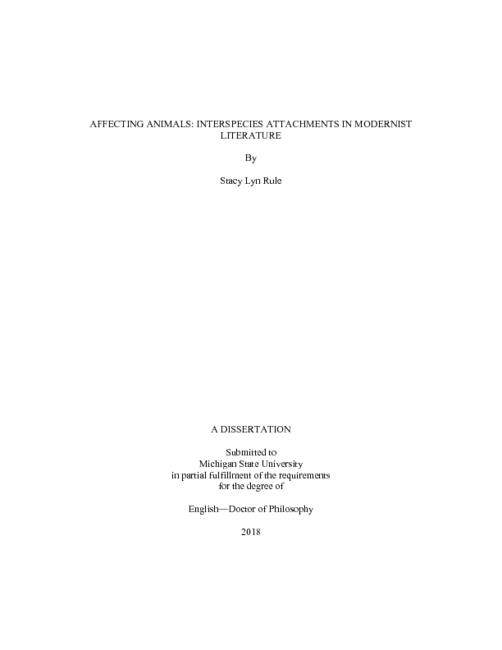 This dissertation examines how animality is implicated in the making of affect in the literary modern period. Looking to the theories of Henri Bergson, Sigmund Freud, and Silvan Tomkins, I consider how these thinkers set boundaries between human and animal capacities for feeling. I then attend to how modernist authors respond to these protocols. Chapters one through three read interspecies affect in the narratives of William Faulkner and Ernest Hemingway, showing how they attempt to revise modern expectations of how animals can move people. The final chapter looks to how animals inform Djuna Barnes’ impersonal affect theory. This paper broadens our understandings of modernist affect, arguing that we cannot grasp the full spectrum of feelings in modernity without attending to animality. It is further significant because it gives careful attention to animal experiences in the literature, attempting to read them alongside anecdotal and scientific speculations about the emotional habits, perceptual abilities and social lives of animals. This approach fills a gap in current scholarship that interrogates modern constructions of animality but fails to explore how these fantastic attachments impact the lives of animals.