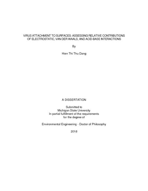 "Adhesion to surfaces plays an important role in determining pathogen transport and fate in the environment. Countertops, hospital walls, hair and skin are examples of surfaces of particular interest. While bacterial adhesion is relatively well understood, less is known about interactions of viruses with surfaces of different charges, hydrophobicities and morphologies. In this study, the attachment of bacteriophage MS2 and human adenovirus 40 (HAdV40) onto polyelectrolyte- and paint-coated surfaces has been investigated using an approach that combines experimental studies and theoretical modeling. The extended Derjaguin-Landau-Verwey-Overbeek (XDLVO) model was used to calculate the energy of virus-surface interaction. The theoretical predictions were validated in experiments that used quartz crystal microbalance with dissipation (QCM-D) to measure the mass of deposited viruses. The polyelectrolyte-coated surfaces were designed by assembling a polyelectrolyte multilayer (PEM) via alternate deposition of the negatively-charged poly(styrene-4-sulfonate) (PSS) and positively-charged poly(dimethyl diallyl ammonium chloride) (PDAD). The paint-coated surfaces were prepared by spin-coating three household paints (water-based acrylic latex, water-based alkyd, and oil-based alkyd), which differed in terms of their chemical composition, surface charge and hydrophobicity. Experimentally observed trends in experiments MS2 deposition onto the polyelectrolyte -coated surfaces were consistent with XDLVO predictions: a) deposition onto the positively-charged surface was significantly ( 50303 to 6 times) higher than on a negatively charged one and b) deposition was enhanced at higher ionic strengths of the background electrolyte. The kinetics of deposition depended on the salinity: lower salinity led to faster deposition and a shorter time to steady-state. The data on kinetics of HAdV40 adhesion to the household paints was also in a qualitative agreement with predictions by the XDLVO theory. The quantitative discrepancies between QCM-D experiments and XDLVO theory were attributed to details of the surface morphology and the chemical heterogeneity of the deposited paint layer. For both viruses and all surfaces studied, the electrostatic and hydrophobic interactions were found to govern virus deposition behavior with van der Waals interactions playing a comparatively small role. The approach demonstrated in this study can guide the design of surfaces that resist virus adhesion. Polymeric coatings and paints so formulated should help reduce human exposure to viruses."--Pages ii-iii.