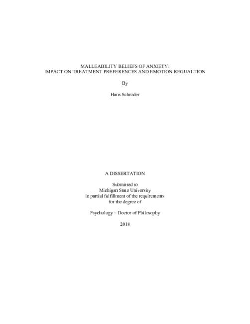 Malleability beliefs of anxiety : impact on treatment preferences and emotion regulation