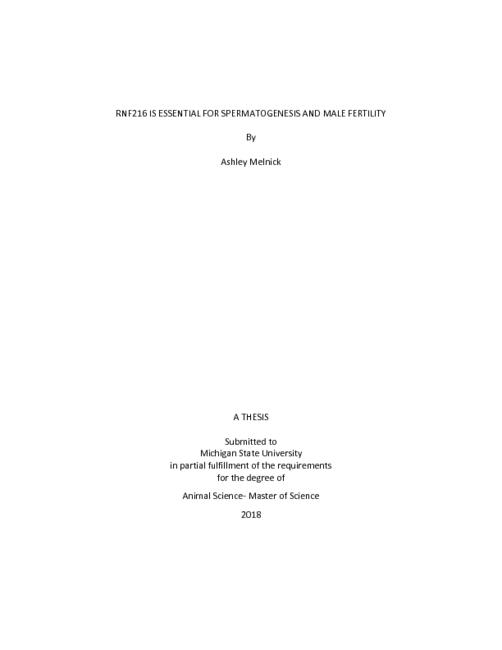 "Spermatogenesis is a specialized differentiation process in which male germ cells undergo meiosis to form motile sperm. Interruptions in spermatogenesis, resulting in immobile, irregular, or lower concentrations of sperm, lead to male infertility. Mutations in genes involved in spermatogenesis have been shown to cause male infertility. RNF216 is a member of the RING finger domain family of E3 ubiquitin ligases that are involved in protein degradation. The physiological function of RNF216 in mammals in unknown. Here we show that RNF216 is highly expressed in the mouse testes. Targeted deletion of RNF216 in mice reveal that RNF216 is required for spermatogenesis and male fertility. However, RNF216 is not essential for animal viability or fertility in females. We further demonstrate that RNF216 exhibits E3 ubiquitin ligase activity in vitro. These findings underscore a potential function of RNF216 mediated protein degradation in mammalian germ cell development and male fertility."--Page ii.