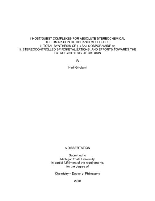 I. Host/Guest Complexes for Absolute Stereochemical Determination of Organic Molecules ; II. Total Synthesis Of ( - )-Salinosporamide A ; III. Stereocontrolled Spiroketalizations, and Efforts Towards the Total Synthesis of Obtusin