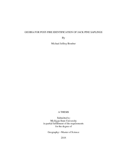 Wildfire is a natural and necessary process which causes both devastation and regeneration to forested landscapes. One such event, the Duck Lake Fire, occurred in the Upper Peninsula (UP) of Michigan in the United States in 2012. The burn area is overseen by the Michigan Department of Natural Resources (MDNR) and encompasses approximately 8900 ha (21,000 acres) near the mouth of the Two Hearted River on the south shore of Lake Superior. After the fire, replanting by the MDNR and natural regeneration has taken place. Unmanned Aerial Systems (UAS) imagery of ten 1-ha study plots were collected via a MicaSense Red Edge camera simultaneously capturing images in the Red, Green, Blue, Red Edge and NIR bands. Images were collected at 60 meters altitude with platform velocity of 6 m/s. Geographic Object-Based Image Analysis (GEOBIA) in eCognnition Developer was conducted to assess the regrowth of jack pine in the Duck Lake forest and answer three questions: What is the level of accuracy that can be achieved via GEOBIA for detecting young jack pine saplings? How does the use of the Red Edge (RE) spectral band affect image classification accuracy? How does seasonal change affect the accuracy that can is achieved by the UAS and GEOBIA method? GEOBIA classification accuracies ranged from 59.5-97.5% with the NIR-R band combination performing the best overall and RE performing the worst. An overall increase in accuracy was observed as the season progressed with the highest average accuracy in time three (T3) at 78.4% across all bands.