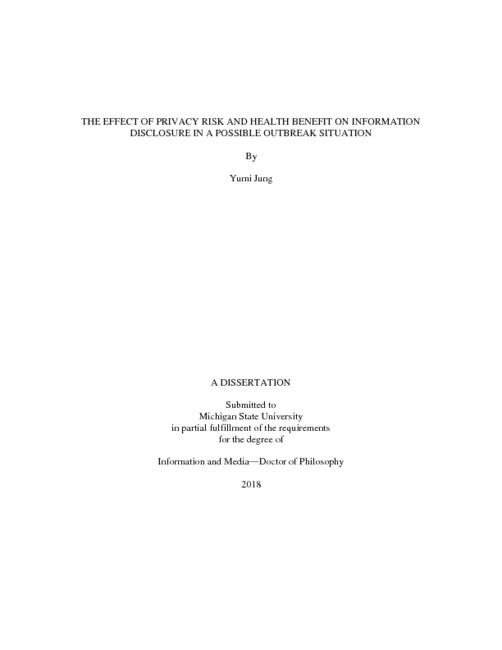 An individual's privacy is not a static state; rather it is a decision process encompassing both privacy risks and benefits that the individual encounters in situations requiring information disclosures. Also, privacy is multi-level, including both individual as well as group concerns. The purpose of this dissertation was to understand how much individuals disclose personal information when different dimensions of privacy risks and benefits were present, and to what extent information disclosure affected privacy concerns. This dissertation manipulated the situation where an individual met privacy risk and health security benefits, a situation of gaining security but losing privacy, or vice versa. The two proposed studies in this dissertation performed to better understand this tension. Each study manipulated different situations of benefits and risks, and encouraged participants to make a decision regarding their privacy in a health security context.--From abstract.