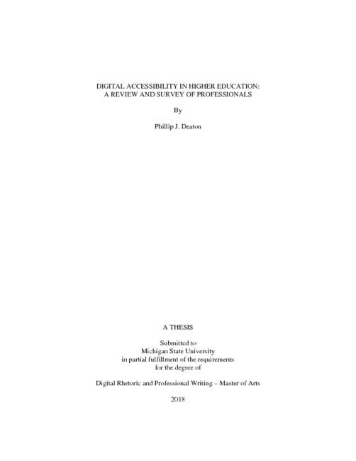 "This study focuses broadly on addressing the issue of digital accessibility for persons with disabilities in higher education. This study presents a review of research on digital accessibility in higher education. This study also presents data from a survey distributed to accessibility professionals in higher education. The goal of this research was to understand the work of accessibility professionals in higher education. Overall this study discusses three major findings. 1) digital accessibility coordinators are a new and undefined role in organizations (30% of individuals indicated that the role was less than a year old at their institution and 43% indicated that the role was 1-2 years old. 2) priorities for digital accessibility work are varied, but focused on training, workshops, and consultation, and 3) executive administration involvement for accessibility needs to be increased. Only 30% of respondents indicated that they had regularly scheduled meetings with executive leadership. Ultimately, the study provides insight into the role of the digital accessibility coordinator, the types of activities that accessibility professionals do or should do, and how executive leadership is involved in digital accessibility conversations. Other findings relate to how reasonably-resourced accessibility professionals believe accessibility is within institutions and how important it is to understand higher education contexts to determine how to do accessibility work within diverse organizations."--Page ii.