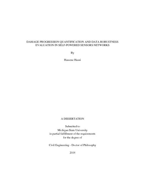 "This research proposes novel damage progression quantification and data robustness evaluation approaches, for structural health monitoring (SHM), using a new class of self-powered piezo-floating-gate (PFG) sensors. This system relies on harvesting the mechanical energy from structures through the direct effect of piezoelectricity. The operating power of the smart sensor and the data used for damage identification is harvested directly from the sensing signal induced by a piezoelectric transducer under dynamic loading. The developed models integrate structural simulations using finite element method (FEM) techniques, experimental studies, and statistical and artificial intelligence (AI) methods. In this work, the performance of the sensing system in identifying damage is investigated for various damage scenarios based on numerical and experimental studies. Both steel and pavement structures are studied. A new surface sensing approach for detecting bottom-up cracks in asphalt concrete (AC) pavement is proposed. Two types of self-powered wireless sensors are investigated in this research. Different data interpretation techniques are developed for each type of sensor. The data are obtained from finite element simulations, or experimental measurement, and are fitted to probability distributions to define initial damage indicators. Sensor fusion models are developed based on the concept of group-effect of sensors, in order to increase the damage detection resolution of individual sensors. Probabilistic neural network (PNN) and support vector machine (SVM) methods are used to improve the accuracy of the proposed damage identification methods for the case of multi-class damage progression. The proposed work is divided into four main parts: (i) Damage identification in steel structures using data from a uniform PFG sensor, (ii) Damage detection in steel and pavement structures using a non-uniform PFG sensor, (iii) Damage detection and localization in steel frame structures using hybrid network of self-powered strain and vibration sensors, and, (iv) a field demonstration of the new technology on the Mackinac Bridge in Michigan. The cases of the U10W gusset plate of the I-35W bridge in Minneapolis, MN, a steel girder, a steel plate under compaction tension mode, and an AC beam under three-point bending configuration are investigated. A surface sensing approach to detect bottom-up cracking in AC pavement under dynamic moving load is also proposed. This approach is based on interpreting the data of a surface-mounted network of sensors. Moreover, a hybrid network of strain and vibration-based sensors is used to detect damage in bolted steel frames. The objective is to establish a local-to-global strategy for damage identification in frames. Data fusion models combined with AI classifiers are developed. Uncertainty analysis is performed to verify the performance of the sensors under different noise levels."--Pages ii-iii.