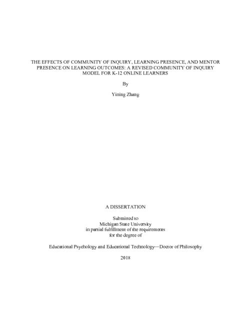 "Amid an explosive increase in K-12 online education in the United States, the quality of online learning has become a primary concern for researchers, educators, and policymakers. Two theoretical frameworks, Community of Inquiry (CoI) and self-regulated learning (SRL) have provided especially insightful explanations of how students learn in online settings. The present dissertation proposes a revised CoI framework that incorporates learning presence (i.e., self-efficacy and SRL strategies) and mentor presence and connects to learning outcomes in K-12 online setting from a sample of 696 high-school level online learners. The study yields four key findings: First, in contrast to Shea and Bidjerano's (2010) model, this study found a significant relationship between teaching presence and SRL, and a non-significant relationship between teaching presence and self-efficacy. Second, because learning under the supervision of a mentor is a unique feature of K-12 online learning, this study found that mentor presence significantly predicted students' use of self-regulated learning strategies. Third, when using the revised framework to predict learning outcomes (i.e., satisfaction, perceived progress, final grade), it was found that the hypothesized model containing CoI and SRL can be related to learning outcomes, thus answering previous scholars' calls for a realistic integration of learning presence and learning outcomes into the CoI framework. And fourth, based on a comparison of two groups of students with different primary online learning locations (i.e., at-home vs. at-school), the study found that at-school students showed significantly less feelings of isolation, higher ability in generating curiosity once the online learning starts, higher perceptions on mentor's practice as a problem solver, and higher goal-setting and help-seeking strategies than those whose primary online learning location is at home. In short, this study is among the first to shed light on the relationships among CoI, self-efficacy, SRL, and learning outcomes in a K-12 online-learning context. Its findings establish the capacity of the proposed theoretical framework to identify important components in K-12 online learning while striking a delicate balance between extensiveness and parsimony. This study also extends our understanding of the mechanisms of online learning among K-12 students, and thus has considerable practical implications for online educators as well as future researchers. Specific recommendations for future research projects are also provided."--Pages ii-iii.