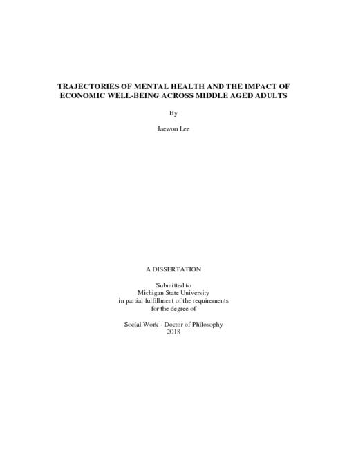 Mental health is one of several important factors to sustain one's well-being, and as such, poor mental health can lead to significant problems in one’s quality of life. Although mental illnesses are prevalent in middle-aged adults and the importance of mental health in general has been discussed in many studies, mental health across middle-aged adults has received less attention. Levels of depression have changed over time and lack of economic resources influences mental health. The purpose of this study is to examine trajectories of mental health among middle-aged adults, to investigate which factors influence the trajectories of mental health, and to explore the effects of economic well-being on mental health during middle age. The National Longitudinal Survey of Youth 1979 (NLSY79), which is a nation-wide representative data set for individuals in the United States, was used for analysis. A sample of 834 individuals who discussed their mental health status at four points in time (34, 36, 40, and 50 years of age) was analyzed. The latent growth model was conducted using M-plus statistical package. The research questions are as follows: 1) What are the trajectories of mental health among middle aged-adults (34 to 50 years of age)? 2) Is economic well-being (net worth and employment) associated with mental health? Major findings reported in this study were that the trajectories of mental health show non-linear change, with lowest levels of depression at 40 and higher levels of depression at 34, 36, and 50 years of age. Male, self-esteem, cognitive ability, health insurance, employment, and net worth predicted lower intercepts of depression. In addition, even after including time-varying covariates, the trajectories of mental health still show non-linear change. Employment was associated with lower risks of depression at 34, 36, 40, and 50 years, and net worth was also associated with lower risks of depression at 34, 36, and 50 years. This study confirms the trajectories of mental health among middle-aged American adults within longitudinal setting by using four waves. Compared to previous studies, which have been primarily conducted with a cross-sectional approach, this study contributes further evidence in understanding trajectories of mental health among middle-aged adults. In addition, the findings support the hypothesis that employment and net worth have a significant impact on mental health during middle age. Middle age is a stage greatly influenced by economic resources as individuals become more responsible for their lives at an economic level and face economic challenges that can ultimately affect depression. Understanding the effects of economic well-being on depression among middle-aged adults helps to pinpoint a specific period of time for interventions to improve poor mental health. This period of time in life may thus require more attention and care before levels of depression begin to increase. The findings provide a rationale, which calls for increased job and job training opportunities, as well as educational programs regarding saving and wealth accumulation in order to improve poor mental health and achieve social justice. Furthermore, it provides grounds for social workers to further advocate for and protect individuals who suffer from mental health and have poor economic well-being.
