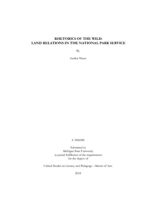 This thesis examines the rhetorics of wilderness employees in Sequoia & Kings Canyon National Parks in an effort to better understand the relations privileged, cultivated, and honored in wilderness areas by the National Park Service. Specifically, this thesis seeks to trace the legacies of colonialism as they manifest in the rhetorics of wilderness employees and to find sites of anticolonial possibility within those rhetorics. Drawing on the work of Indigenous philosophers, environmental historians, and rhetorical theory, this thesis makes three moves: First, it discusses the ways that wilderness employees simultaneously reify and resist colonial logics in their articulations of what wilderness is and does. Second, it examines wilderness employees compositional practices—they ways in which they literally build, maintain, and craft wilderness lands for particular ways of being and knowing. Third, it delves into wilderness employees’ relationship with the lands they care for and suggests that these relationships are pushing against colonial notions of inanimate land, ownership, and the prioritization of settler desires over the sovereignty of land.Ultimately, this thesis finds that the rhetorics of wilderness employees indicate that there is great anticolonial possibility in the National Park Service.