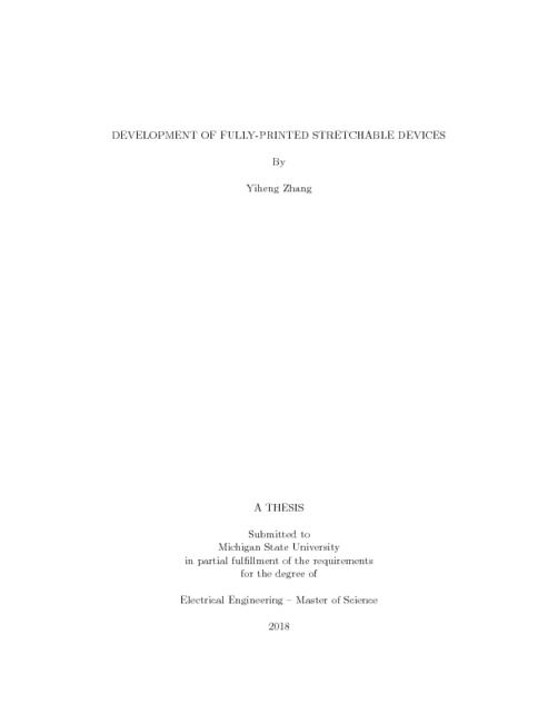 In recent years, stretchable flexible electronics has become a research hotspot in the electronics industry and academia due to its outstanding expansibility, adaptability, and portability.With the improvement of science and technology, materials science, mechanics, and manufacturing process have all achieved rapid development. Advanced technologies have madepossible the manufacture of stretchable flexible electronic devices with excellent performance.In the first half (chapter 2) of this thesis, we developed an inkjet printing method topattern silver nanowires (AgNWs) with length of up to ̃ 40 m on various substrates. Welldefined and uniform AgNWs features could be obtained by optimizing the printing conditionsincluding nozzle size, ink formulation, surface energy, substrate temperature, and printingspeed. Such printed AgNWs have been used to demonstrate bi-axially stretchable conductorsthat could maintain stable conductance under an areal strain of up to 156% (256% of itsoriginal area). By printing the AgNWs electrodes on a composite composed of PDMS andelectroluminescent (EL) phosphors, I have demonstrated a printed stretchable EL display. Inchapter 3, I developed a silver nanoparticles (AgNPs) based stretchable sensor for pressuresensing through directly printing AgNPs on Polyurethane Acrylate (PUA) substrate. Highsensitivity is indicated while I test it within a low-pressure load. Its resistance increases100% when a 5.5 kPa pressure is applied on it. I explored the applications of heartbeatdetection and wind sensing in this work.