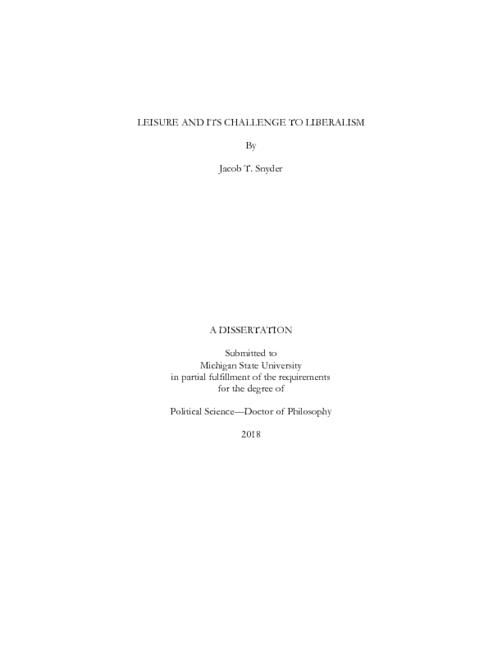 This dissertation asks the most basic of philosophical questions: what is it? More specifically, it asks the nature of leisure, including its nature within liberal life. Chapter One turns to Aristotle, who offers the most substantial and elevated account of leisure. I interpret and defend Aristotle’s account as a “way of being,” which means it is itself the end and goal of several virtues, material equipment, and a thorough education. This particular way of being is found to be the goal and purpose of Aristotle’s ideal regime. The liberal project, however, presents a competing ideal in the example of the laborer. In Chapter Two, I argue that Locke holds work and labor to be necessary to human happiness, especially with work’s necessary role in rational self-authorship. This interpretation is offered as a more complete account of liberalism, where the tendency is to view work and labor as merely a means to legitimate wealth. I argue that Locke’s defense of work and labor is more thorough, leading to both political as well as individual felicity. And instead of stopping here, at this comparison of the competing poles of leisure and labor, I also analyze vocation as both a complement to the labor described by Locke, but also as a way of incorporating elements of leisure into contemporary life. In the same way that Aristotle understands leisure as the ground of doing something for its own sake, Weber also understands vocation to be a “living for,” even if it is always also a “living from.” Though there are important points of distinction between leisure and vocation, and though vocation has its own internal pathologies, vocation is our best answer to and incorporation of classical leisure.
