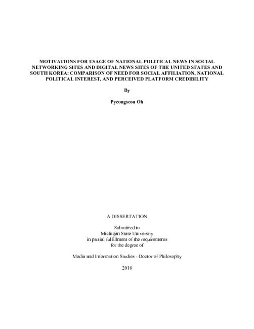 Motivations for usage of national political news in social networking sites and digital news sites of the United States and South Korea : comparison of need for social affiliation, national political interest, and perceived platform credibility
